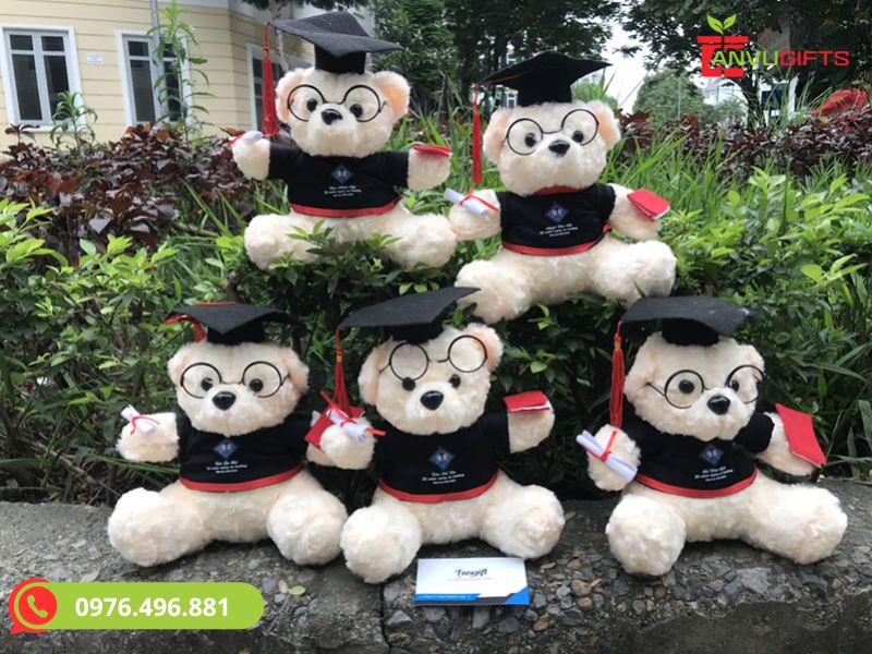 Món quà tinh thần đáng yêu, phù hợp cho các cấp học nhỏ hơn. Gấu bông mặc cử nhân hoặc gấu bông in logo trường thường được chọn trong lễ tốt nghiệp.